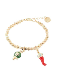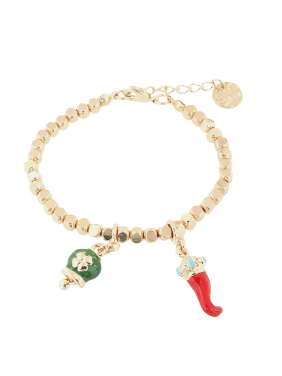 Bracciale in Metallo con ciondoli portafortuna, campanella smaltata verde e corno in smalto rosso - 3571791