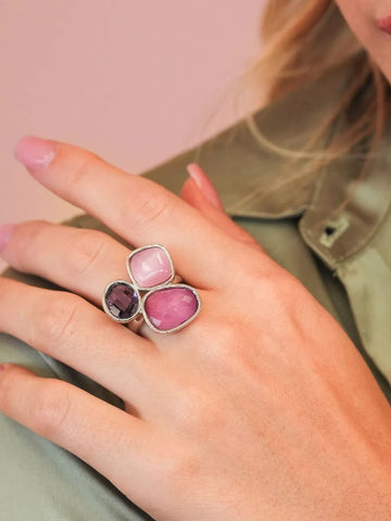 Anello rodiato con cristalli, taglio briolette e cabochon, di colore rosa shocking, rosa e ametista.