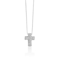 Tra le collane di diamanti, il pendente a croce è quello più legato alle cerimonie. Per un battesimo o comunione, questo gioiello è un prezioso simbolo che accompagnerà per tutta la vita. Eterno come l'oro bianco e le due file di diamanti che compongono la croce 9x11 mm.