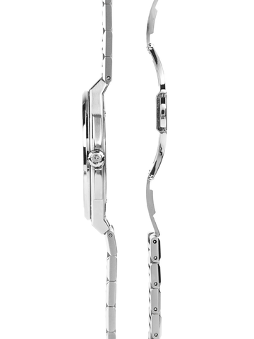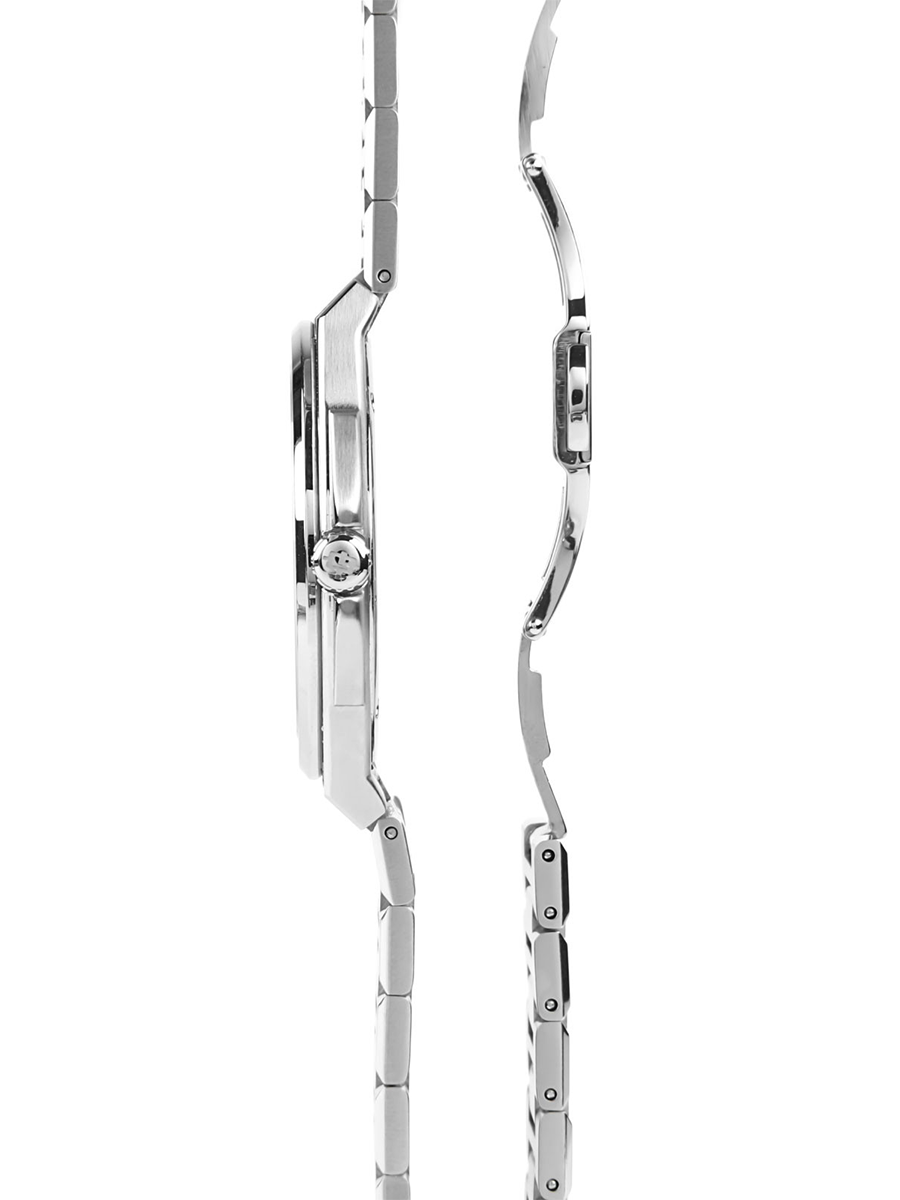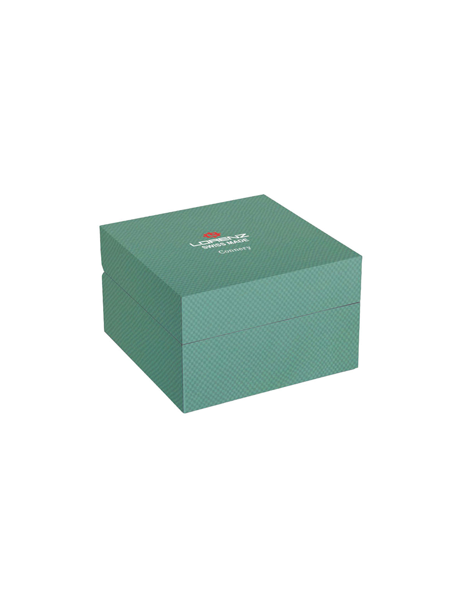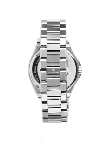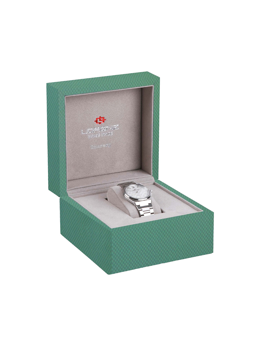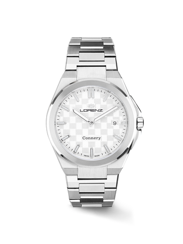 Il Connery si aggiunge alla collezione Swiss Made di Lorenz. È un orologio extra piatto con bracciale integrato, nato alla fiera dell'Orologeria del 2023. La cassa rotonda in acciaio 316L da 40 mm, con uno spessore ridotto di soli 7 millimetri, esalta sia l'eleganza che la robustezza dell'orologio, il fondello è fissato da 4 viti. Il bracciale scalare da 23,5 a 18 mm in acciaio presenta maglie ad H con superfici satinate e lucide, conferendo una brillantezza unica. Il vetro zaffiro piatto protegge un quadrante ispirato al tessuto principe di Galles. Il movimento al quarzo Swiss Made Ronda 714, con due sfere e datario a ore 3, garantisce un’autonomia fino a 5 anni. La corona a pressione assicura un’impermeabilità fino a 7 atmosfere. Il Connery unisce perfettamente eleganza e sportività.