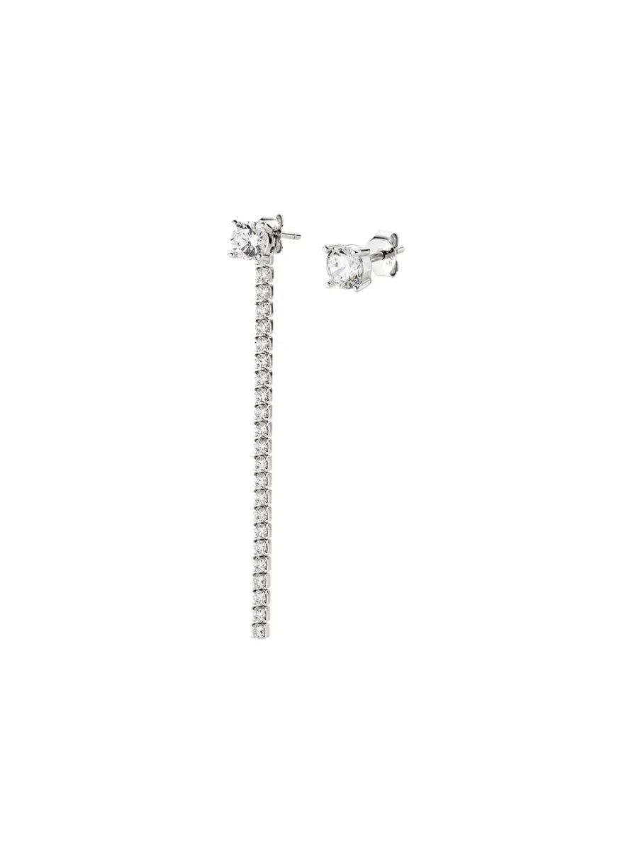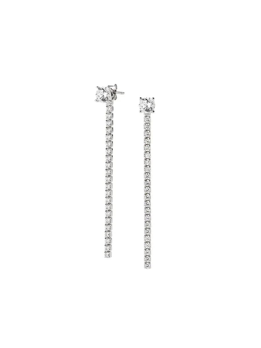 Orecchini argento 925 rodiato con zircone punto luce da 5 mm e catena con tennis di zirconi bianchi di 2 mm. È possibile rimuovere la catena e indossare soltanto il punto luce, mischiando l'uno e l'altro per un look dinamico e versatile. Lunghezza totale degli orecchini: 5,5 cm. Chiusura con perno e farfallina.