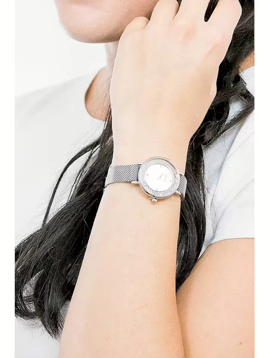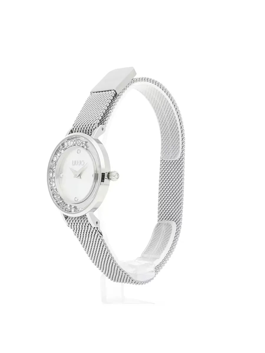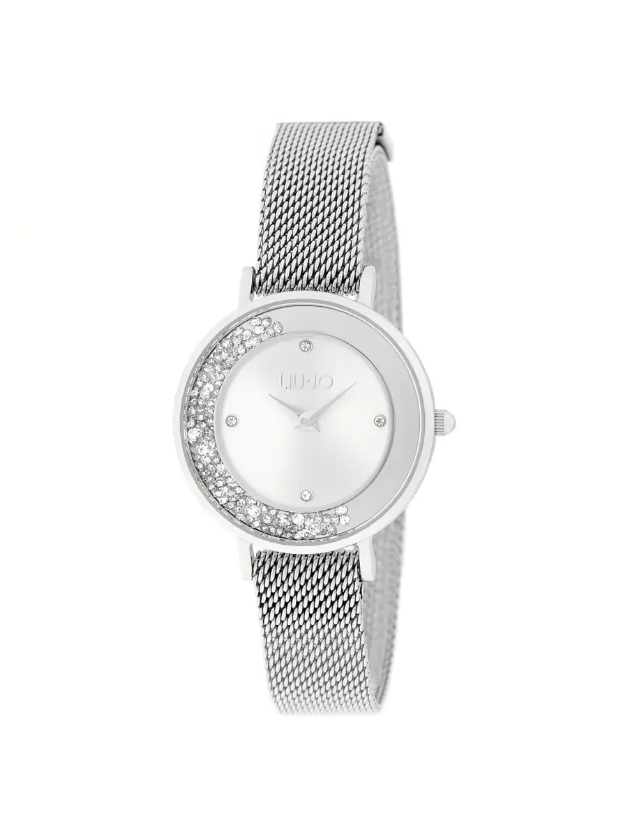 Orologio solo tempo da donna di liu jo della collezione mini dancing slim. Orologio con cassa in acciaio inossidabile di colore silver del diametro di 35 mm e quadrante di colore silver. Cinturino in acciaio inossidabile di colore silver. Vetro: minerale, pietre: esclusivi cristalli mobili sul castone. La resistenza all'acqua è di 3 atm e il movimento è miyota cal. Gl20. La referenza è tlj1687
