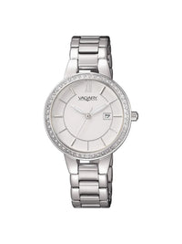 Cassa in acciaio con 48 cristalli sulla lunetta. Bracciale acciaio. Vetro minerale. WR 5 bar.