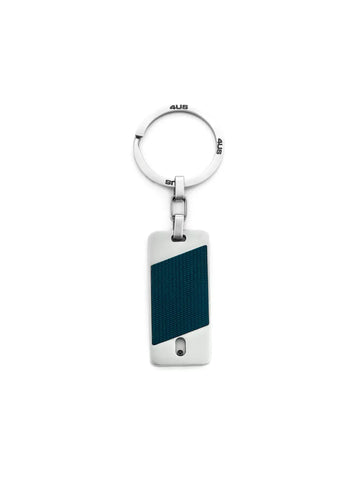 Portachiavi in acciaio inox con texture blu e zircone nero nella parte bassa.