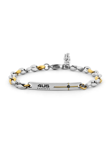 Bracciale da Uomo della marca 4US Cesare Paciotti. Il giropolso è realizzato in acciaio inossidabile. La catena è una maglia bicolore con targhetta centrale e zircone nero incastonato. La lunghezza è regolabile tra 18 cm e 22 cm grazie alla catena di allungo. La chiusura è con maglia a moschettone.