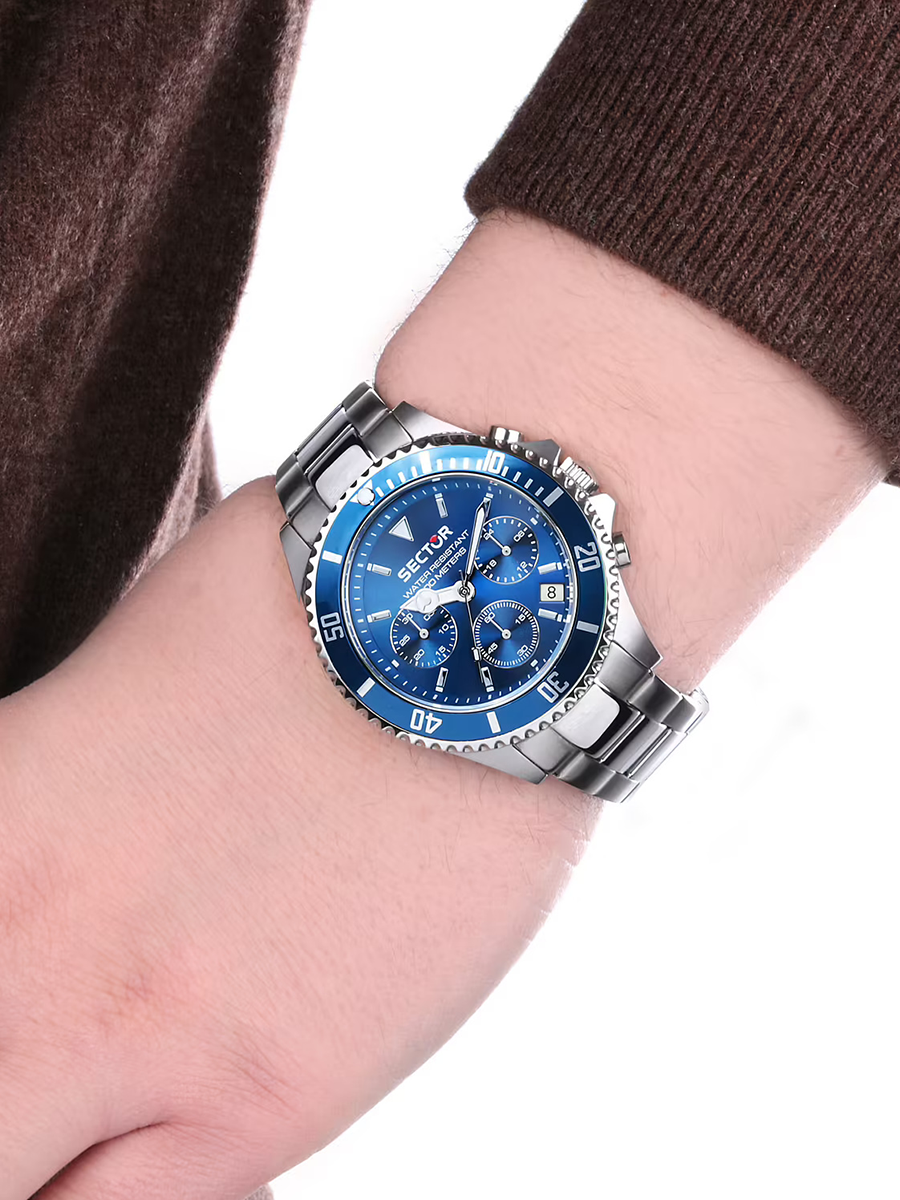 Genere : Uomo, Sector experience: No Limits, Dimensione cassa: 43.00, Materiale e finitura cassa: Acciaio, Polished, Misura cassa: 50,2 x 43mm, Spessore cassa: 11,9, Finitura cassa: Polished and satined, Colore: Silver, Vetro: Vetro minerale, Materiale cinturino: Bracciale in metallo, metallo, Colore cinturino: Acciaio, Fibbia: Diver buckle w/safety lock, Chiusura: Diver buckle w, Safety lock, Water resistant: 10 atm, Garanzia: Ufficiale 3 anni, Ufficiale 2 anni Sector, Sostituzione batteria: Sì, Confezione: Originale Sector